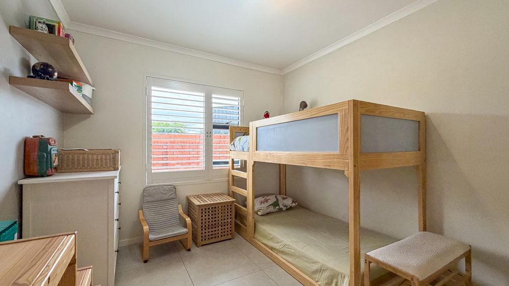 The master bedroom includes a modern en suite bathroom. The remaining two bedrooms enjoy excellent natural light, garden facing windows and ample built in cupboards. Both bathrooms feature contemporary finishes in a neutral and timeless style.
